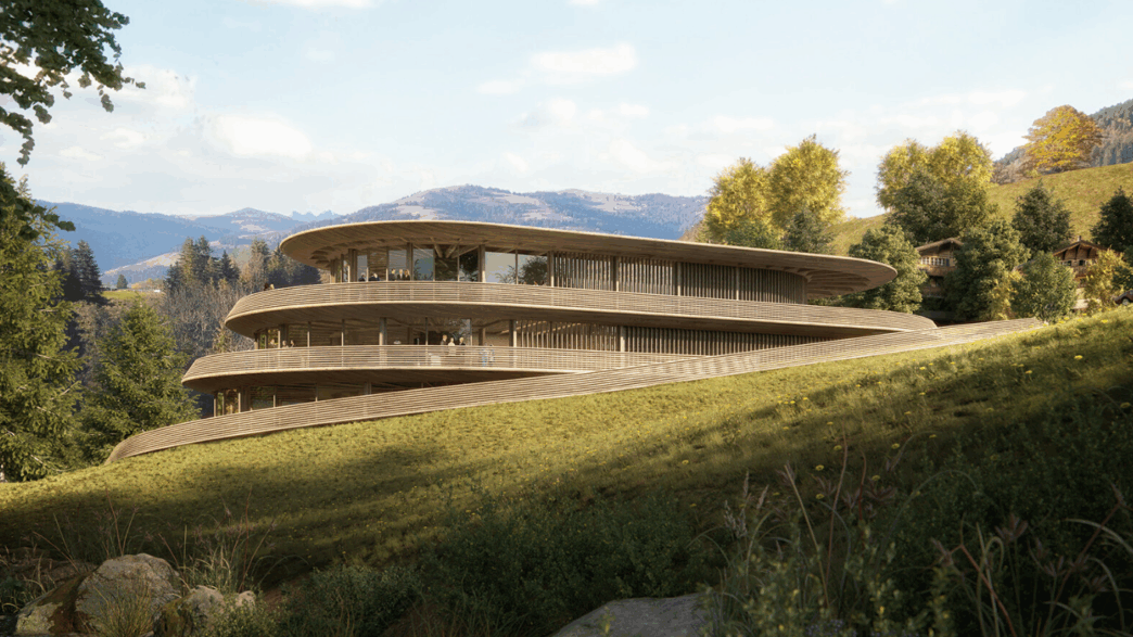 Здание Gstaad House гармонично вписывается в естественные контуры окружающих гор. Его фасад с плавным уклоном и ровной линией крыши повторяет волны холмов, а извилистая рампа, огибающая строение, обеспечивает удобный подъезд и переход между уровнями как для посетителей, так и для автомобилей.