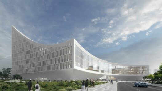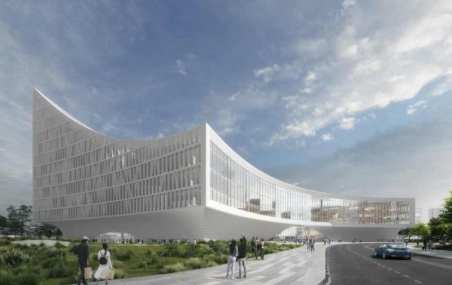 Проект масштабного здания площадью 140 тыс. кв. м разработали специалисты бюро MVRDV. Экстерьер будущего сооружения отличается плавными и «текучими» линиями, т.к. архитекторов во время его создания вдохновлял местный речной ландшафт. Также тут предусмотрены большие панорамные окна и специальные ажурные экраны, защищающие фасады от прямых солнечных лучей.