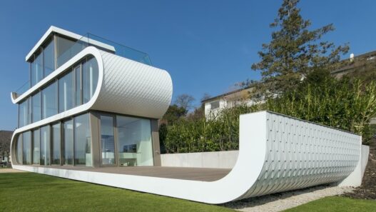 Спроектировали данный объект недвижимости специалисты компании Evolution Design. Площадь построенного несколько лет назад в Швейцарии дома составляет 173 кв. м. Здание получило очень нестандартный экстерьер в виде бетонной ленты и прозрачные фасады. Чтобы не нарушать приватность жизни его обитателей, на окнах имеются жалюзи.