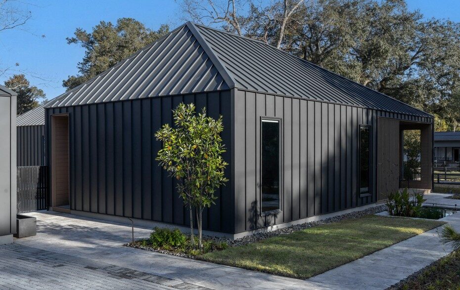В отличие от белых интерьеров комнат, внешние поверхности фасадов комплекса отделаны темными металлическими панелями и сосновым сайдингом.