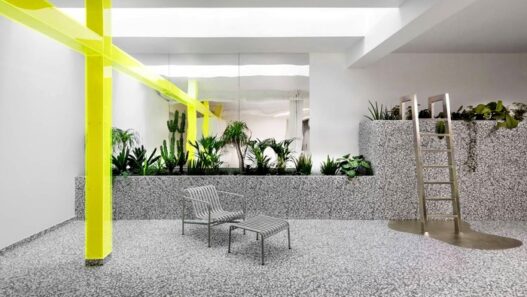 Необычный лофт имеет плошадь 250 кв. м. Его интерьер практически лишен внутренних перегородок. Исключение сделано для четырех изолированных спален и ванных комнат. Чтобы воссоздать в просторной квартире атмосферу 1970-х, авторами проекта был использован бетон, металл, плексиглас и другие популярные в то время строительные материалы. Еще одна интересная особенность такого жилища — зимний сад, устроенный в гостиной.