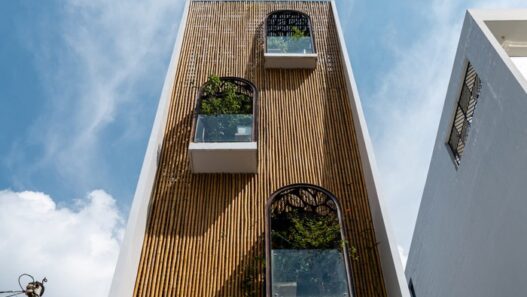 Фасад оригинального сооружения в Хошимине закрывает решетчатый экран из бамбука. Это позволило не только защитить помещения от палящих лучей солнца, но и обеспечило конфиденциальность частной жизни. Бамбуковый навес можно заметить и на крыше объекта.