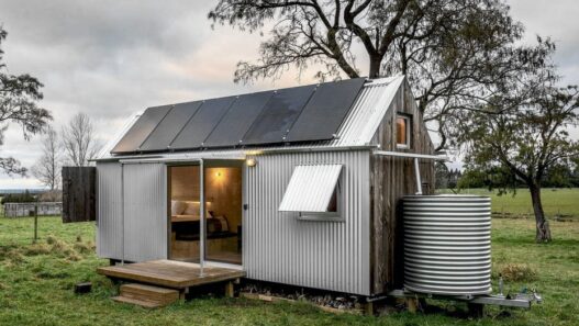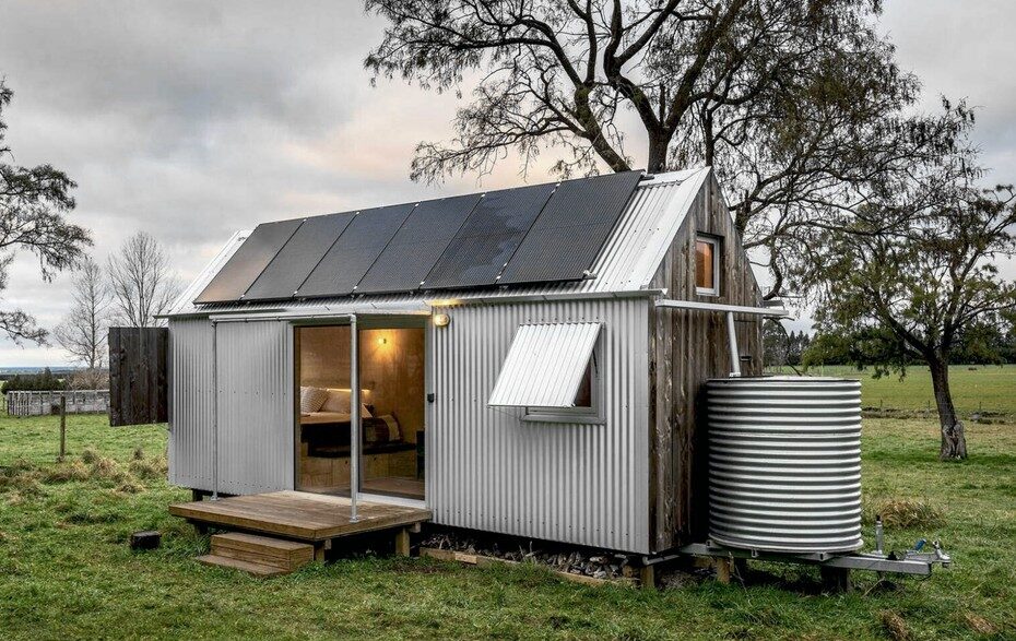 Одноэтажный домик площадью всего 17 кв. м. установили в горах Новой Зеландии. При необходимости такое сооружение легко транспортируется на любой другой подходящий земельный участок. Мобильное здание оснащено солнечными панелями, биотуалетом, дровяным камином, террасой и системой сбора дождевой воды.