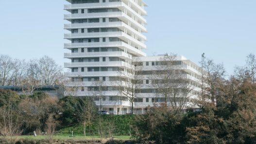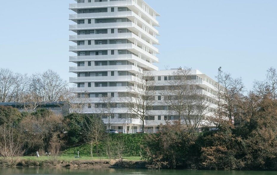 Этот объект, общая площадь которого достигает 7624 кв. м., построили в Тулузе. Новый комплекс с белыми фасадами состоит из 12-этажной башни и 5-уровневнего корпуса. Всего здесь предусмотрено 110 квартир различной планировки и площади (от одной до пяти спален), а также подземный гараж. На крыше пятиэтажного сооружения имеется терраса с бассейном для детей.