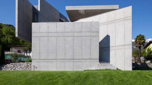 Проект, получивший название Swiss House XXXIV Galbisio, разработали специалисты Davide Macullo Architects. Кубическое по своей форме сооружение общей площадью 260 кв.м. состоит из целого ряда бетонных плоскостей, формирующих нестандартный внешний облик здания.