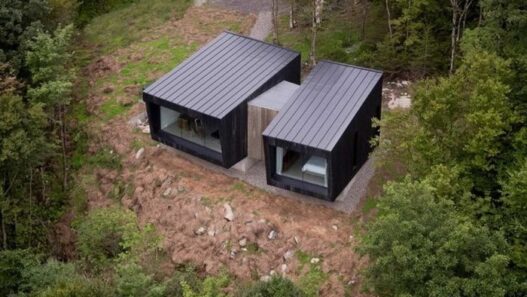 Проект, получивший название La Binocle residence (Резиденция Бинокль), разработали специалисты Naturehumaine. Одноэтажное здание состоит из двух прямоугольных объемов, немного повернутых относительно друг друга. Площадь такого необычного дома составляет 85 кв.м.