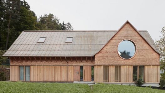 Строительством оригинального особняка занималась компания Innauer-Matt Architekten. Новый объект появился на месте старого разрушенного сарая. Проект получил название «Дом с тремя глазами» из-за наличия больших круглых окон, придающих загородному зданию нестандартный внешний вид.