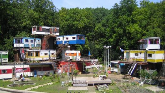 Интересно, что примерно два года назад эти фотографии циркулировали в интернете, и никто не знал, что это в точности за трейлеры. Все думали, что это какой-то зажиточный человек построил себе такое жилье; веб-сообщество так и прозвало этот трейлер-сет «особняк жлоба». В любом случае, как в качестве жилья, так и в качестве декораций, этот многоэтажный трейлер вдохновляет на мысли о 60-х. Интересно все же, что ставил амстердамский театр — не «Дядю Ваню» же.