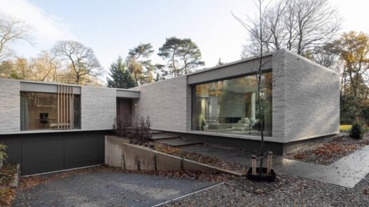 Это одноэтажное жилое здание площадью 415 кв. м. построили в Нидерландах. Семейный особняк с плоской крышей состоит из четырех объемов различной высоты. Архитекторы удачно вписали его в живописный земельный участок с высокими деревьями. Фасады сооружения отделаны двумя видами серого длинноформатного кирпича и украшены вертикальными деревянными жалюзи. Дом получил большую площадь остекления и световые окна в потолках, что позволило эффективно решить здесь проблему дневного освещения.