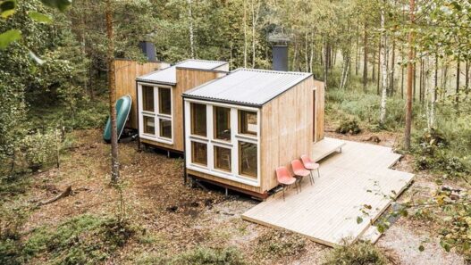 Проект дома площадью 30 кв. м. разработали специалисты Studio politaire. Одним из основных требований к такому сооружению являлся сравнительно скромный бюджет ($14 тыс.). Возведенное в финском лесу здание состоит из четырех слегка смещенных комнат (кухня, гостиная, спальня и сауна).
