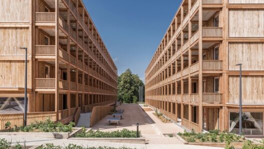 Временные деревянные здания предназначены для расселения тут свыше 300 мигрантов. В двух пятиэтажных домах, спроектированных acau architecture, имеется 230 модульных квартир. Общая площадь данного объекта составляет 7070 кв. м. Примечательно, что фундаменты сооружений тоже сделаны из дерева.