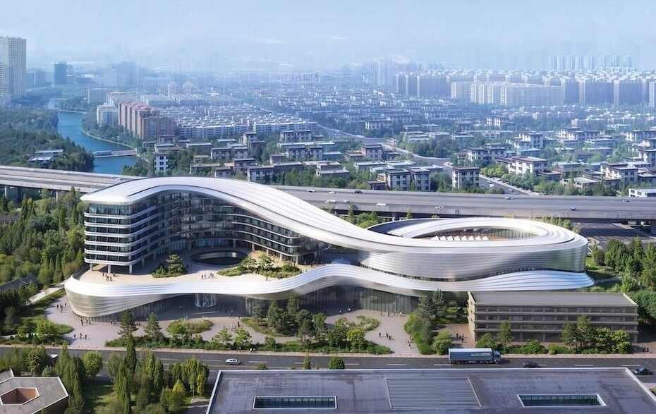 Дизайн зданий отличается множеством изогнутых форм, которые вдохновлены полетом чаек и струящейся текстурой шелка. Подобный нестандартный экстерьер комплекса с фасадами, покрытыми алюминиевой оболочкой, соответствует историческому и культурному контексту этого китайского города. Представленный проект призван улучшить инфраструктуру обслуживания в данном районе и должен способствовать развитию местной экономики.