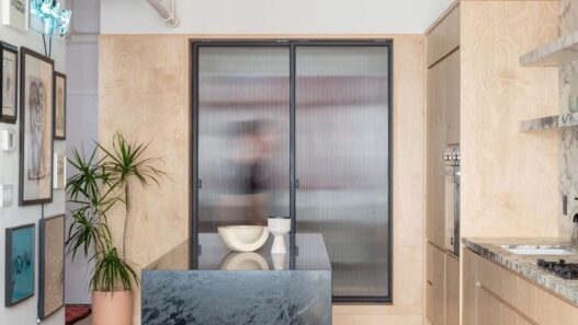 Для отделки квартиры-студии площадью 85 кв. м., расположенной в районе Бруклин, была использована фанера из березы. С помощью этого материала удалось создать оригинальные шкафы, арки, мебель и т.п. В итоге, здесь появилось больше места для хранения различных вещей, а спальная зона оказалась изолированной от остального пространства. Кроме этого, подобное решение позволило добавить мягкости и уюта в общий дизайн интерьера. Деревянные поверхности тут удачно контрастируют с белыми стенами.