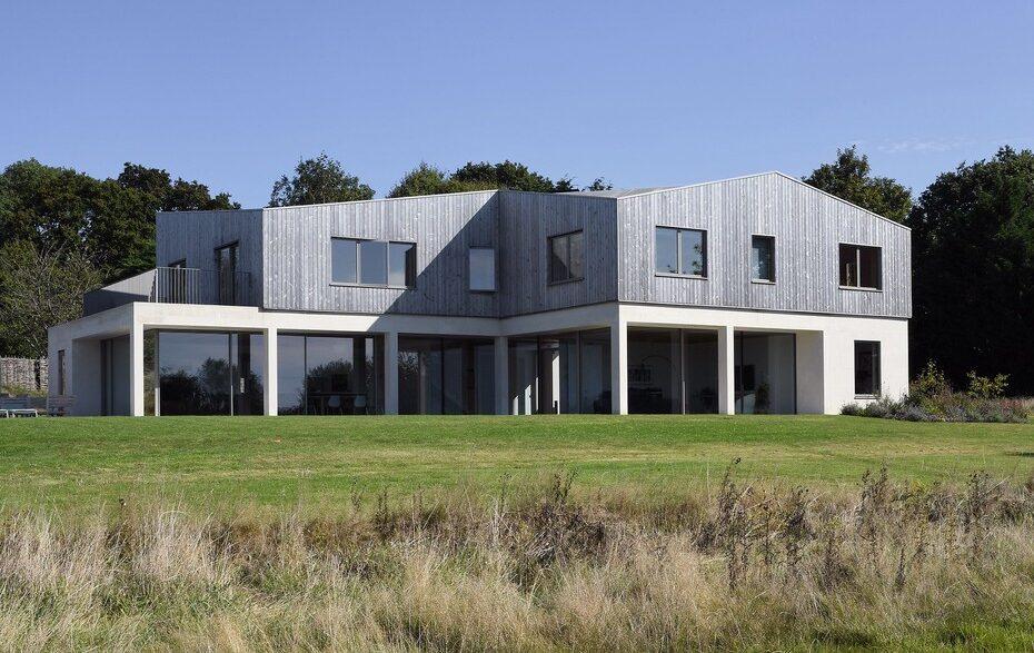 Современный особняк, появившийся в британском графстве Западный Суссекс, спроектировали специалисты Wilkinson King Architects. На каменном фундаменте подобной конструкции возвышается верхний этаж, построенный из клееного бруса. Фасады этой части здания отделаны досками серебристого цвета из красного кедра.