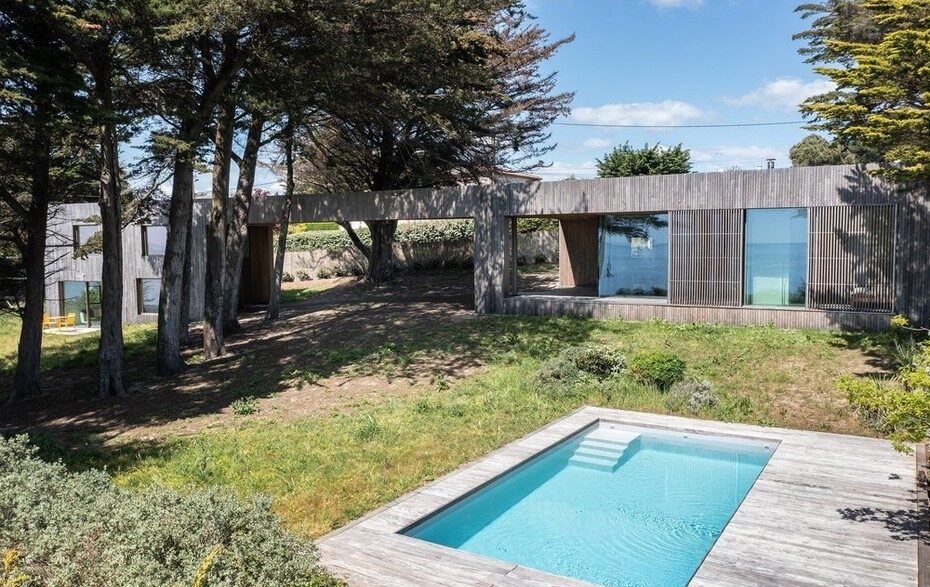 Спроектировала это сооружение архитектурная фирма CHANGE.NL (Нидерланды). Оригинальное здание с панорамными окнами и большими фасадными проемами построили на южном побережье французского региона Бретань. Длинный горизонтальный дом состоит из главной резиденции и пристройки. Рядом с ним расположен бассейн открытого типа. Высокие деревья в данном случае являются не только неотъемлемой частью окружающего живописного ландшафта, но и важной составляющей самой архитектурной композиции.