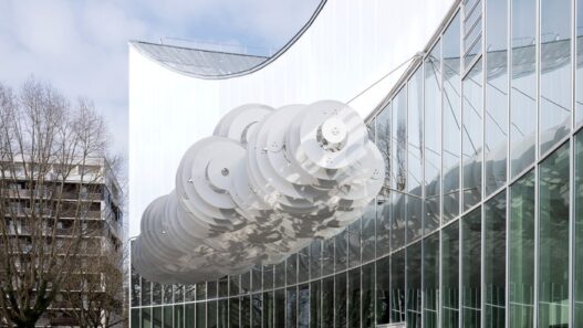 Проект этого четырехэтажного сооружения разработало бюро Tetrarc Architectes. Здание только на первый взгляд выглядит немного квадратным, однако на самом деле некоторые его части получили изогнутые объемы, придающие всему строению определенную элегантность. Первые два этажа со стеклянным фасадом тут прозрачные, а верхние уровни, наоборот, закрыты от глаз посторонних.