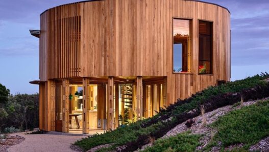 Над проектом St Andrews Beach House трудились специалисты Austin Maynard Architects. Круглое деревянное сооружение площадью 139 кв. м. и радиусом пять метров внутри лишено коридоров, но зато имеет винтовую лестницу. На первом уровне здесь находится кухня, гостиная, столовая, ванная и прачечная. Спальня расположена на втором этаже.