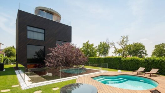 Крыша здания с расположенной на ней джакузи служит открытой террасой. Во дворе дома авторы проекта оборудовали бассейн.