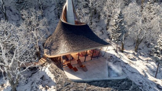 Здание получило изогнутую кровлю, которая облицована черным сланцем. Внутри можно заметить деревянные балки из клееного бруса. Большой стеклянный фасад и открытая терраса позволяют гостям дома без помех любоваться местными пейзажами.