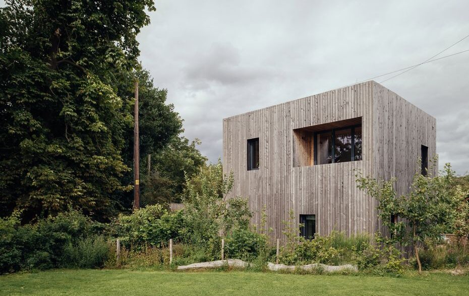 Проект этого загородного дома, возведенного в британском графстве Чешир, разработали архитекторы Studio Bark. Здание состоит из двух больших деревянных объемов кубической формы, соединенных двухэтажным «мостом» с большим панорамным окном. На первом уровне внутри таких квадратных сооружений расположены спальни, а общие жилые пространства — на втором. В третьем «промежуточном» блоке, позади которого предусмотрен гараж, находится лестничная клетка.