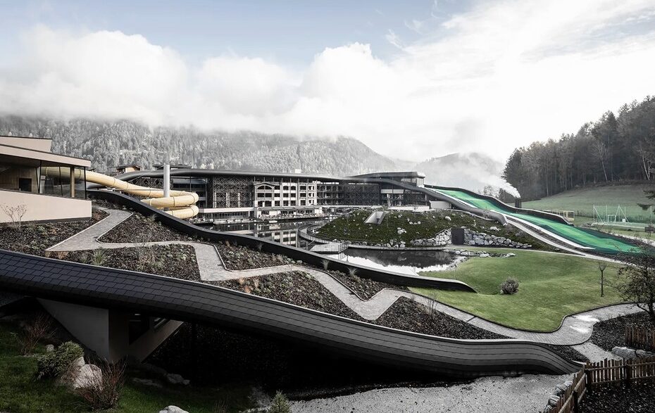 Обновленный отель расположен на территории семейного курорта Falkensteiner Lido в долине Пустерталь. Двускатную крышу здесь заменили на оригинальную волнообразную конструкцию, объединившую новые и существующие постройки. Площадь такой кровли составляет 4900 кв. м., а высота равна 18 м в наиболее высокой точке. Конструкция изготовлена из стали, железобетона и дерева, а также покрыта черепицей из металла.