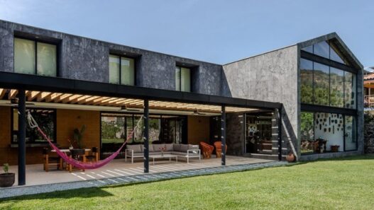 Загородный дом Casa Texcal площадью 483 квадратных метра с двором и террасой находится возле огромной скалистой горы. Он предназначен для проведения семейного отпуска и состоит из двух пересекающихся объемов, образующих букву T. Первый уровень здесь занимает общественная зона и спальня с ванной комнатой. На втором уровне находятся четыре спальни и кабинет. В гостиной, где хранится домашняя библиотека и коллекция масок, установлен двухуровневый деревянный стеллаж.