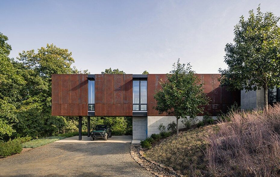 Спроектировали такое жилое сооружение с бетонным цоколем и отделанными металлом фасадами архитекторы компании Olson Kundig. Особняк построили на вершине холма среди виноградников в американском штате Вирджиния. На первом этаже здесь находится коллекция вин владельца недвижимости, а выше расположено центральное пространство — просторная кухня, где встречаются и проводят время обитатели дома и его гости. Также тут имеется гостиная открытой планировки, веранда, главная спальня и помещения для детей. Практически из каждого окна резиденции открываются уникальные виды на живописный пейзаж.