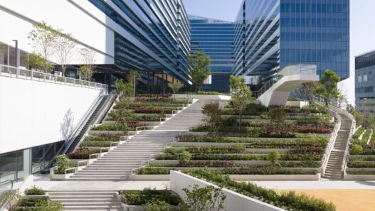 От нее к главному фасаду выставочного павильона ведет лестница шириной