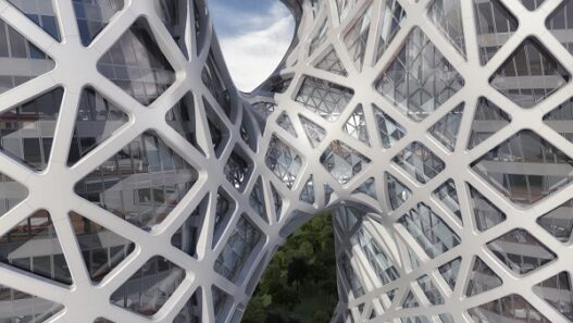 отделку фасадов. Их украсит сетчатый каркас («экзоскелет»), который сделает формы