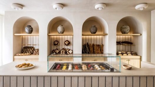На табуретах, изготовленных из массива дерева, покупатели могут сидеть, наслаждаясь горячим кофе и свежей выпечкой. Встроенные полки предназначены для демонстрации продукции пекарни, кухонной утвари и т.п. Арочные ниши и другие части интерьера украшает керамическая плитка.