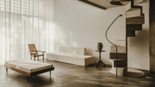 Стены и потолки пространства 10AM Penthouse украшает известковая штукатурка. Здесь предусмотрены каменные полы, имеются льняные занавески и установлены керамические вазы. В оформлении жилого интерьера доминируют черный, коричневый и белый цвета.