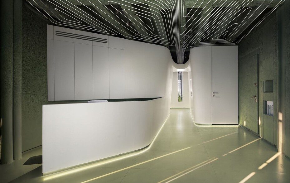 Потолки и стены медицинского учреждения украсила оригинальная сетка с вьющимися растениями, сплетенная из тонких прутьев. В некоторых частях интерьера она формирует необходимую тень для солнечного света, поступающего из окон, а также создает в клинике особую «живую» атмосферу. В цветовой палитре, выбранной для оформления помещений, преобладают белый и зеленый цвета, благодаря чему тут появился уникальный «двойственный» дизайн.