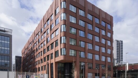 Спроектировали семиэтажный объект специалисты Make Architects. Внешние стены этого сооружения украшает необычная кирпичная кладка, которая имитирует ткани, традиционные для данного города (здесь когда-то работали несколько текстильных фабрик). Подобную непростую кладку сперва выполнили на панелях, а затем отделали ими фасады комплекса.
