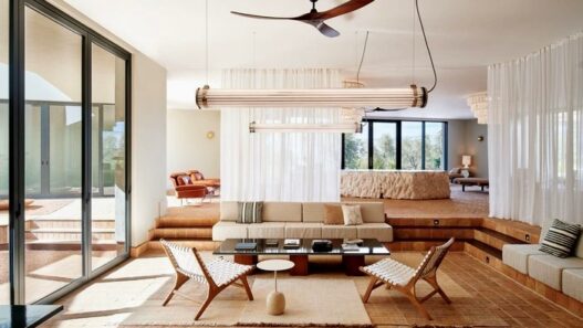 Чтобы создать у гостей ощущение гармонии с местной природой и атмосферу умиротворения, авторы проекта решили использовать в вестибюле и бассейнах такие натуральные материалы, как белый камень и древесину. В других помещениях можно увидеть различные латунные элементы, черные терракотовые стены и темные каменные столы. Для оформления интерьера бара применялись стеклянные лампы, бронзовые зеркала и белые шторы.