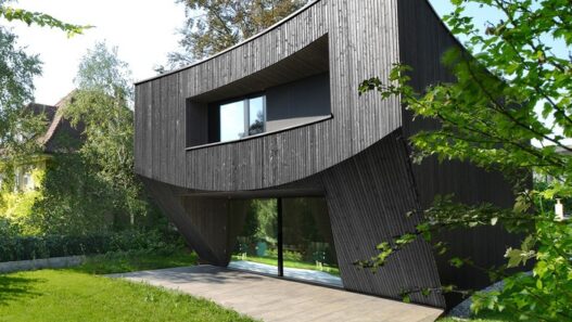 Дом, предназначенный для молодой семьи, получил черный экстерьер и изогнутые внешние стены. Площадью такого здания, базирующегося на бетонном цокольном уровне, составляет 280 кв. м.