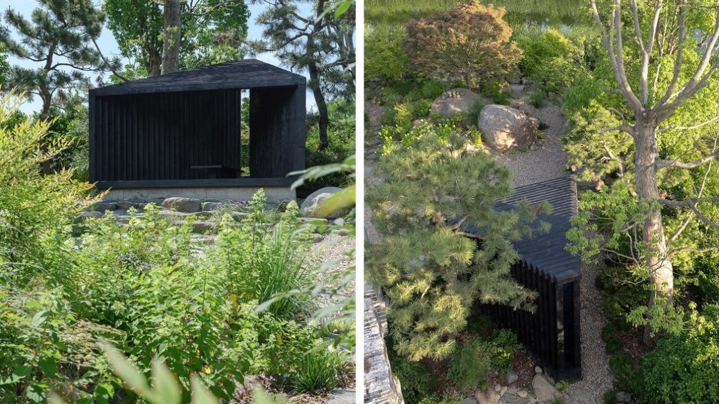 При строительстве павильона была использована обугленная древесина. Этот способ обработки популярного материала придает ему долговечность и водостойкость. В итоге, здание из темного дерева гармонично вписалось в окружающий природный ландшафт, сохранив при этом свой отчетливый архитектурный облик.