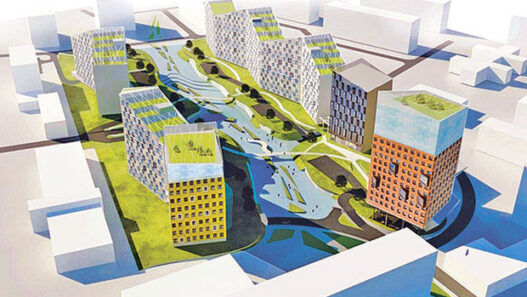 Раньше по этой территории протекала речка Переспа. Сегодня вода бежит по подземному коллектору, над которым ничего нельзя строить. Поэтому над бывшей речкой предлагается разбить пешеходную улицу с хорошим благоустройством. А вдоль нее вырастут здания переменной этажности. В качестве «берегов» выступают платформы-стилобаты, в которых будут расположены объекты сферы услуг, развлекательно-оздоровительного направления, а также несколько паркингов в общей сложности на 1000 машино-мест.