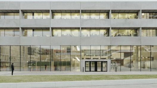 Возведенный объект имеет два внутренних двора. Фасады с аккуратной сеткой окон здесь облицевали камнем. Главный вход, ведущий в вестибюль с оригинальной бетонной лестницей, находится с северной стороны здания. При отделке интерьеров авторы проекта использовали архитектурный бетон и древесину каштана.