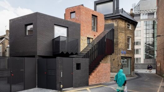 Проект не совсем обычного сооружения разработали специалисты студии Tsuruta Architects. В двух кирпичных зданиях с террасами, возведенных в лондонском районе Катфорд, находится пять квартир. Фасад комплекса украшает черная стальная лестница, перфорированные ограждения и металлические двери с красными ручками.