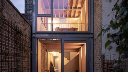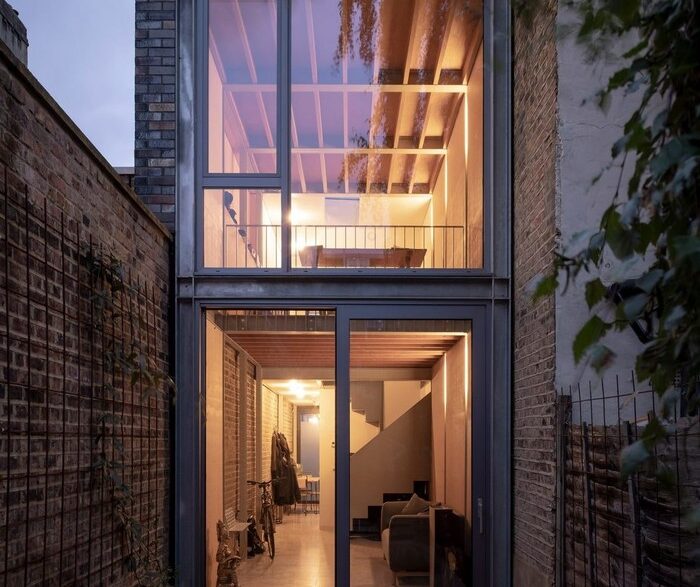 Новый объект пришлось строить в узком переулке между уже существующими домами, поэтому его ширина составляет всего 2,8 метра. В этом проекте архитекторы использовали стальной несущий каркас, поддерживающий внутренние деревянные конструкции. Узкий дом получил большие окна, а для визуального увеличения внутреннего пространства количество перегородок тут минимизировали. Фасады у нестандартного городского сооружения кирпичные.