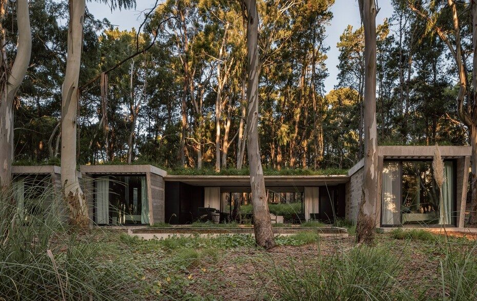 Это жилое здание площадью 282 кв. м возвели на побережье в хвойном лесу недалеко от Буэнос-Айреса. В некоторых местах оригинальная резиденция почти полностью погружена в землю, а свободное пространство между холмами, сформированными данной конструкцией, защищено стеклянными фасадами. Дом также получил стены из монолитного бетона, при этом зеленую крышу объекта украсили различные виды местных растений.