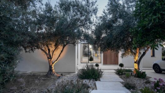 Комплекс зданий общей площадью 207 кв.м. возвели на земельном участке, засаженном оливковыми деревьями. Архитекторы старались свести к минимуму вмешательство в местный ландшафт и стремились сохранить старую рощу, благодаря чему была разработана оригинальная конфигурации объекта с внутренним двориком.