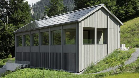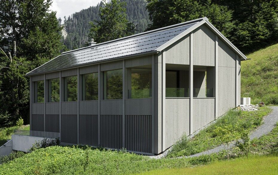 Проект подобного сооружения с минималистичным экстерьером, внешне напоминающим традиционную для данной местности конюшню, разработало бюро Sandro Durrer. Площадь возведенного посреди сельскохозяйственных угодий длинного и узкого дома составляет 390 кв. м. На верхнем уровне здания с двускатной крышей и большим окнами находится общая зона, объединяющая столовую, кухню и гостиную. Через расположенную тут крытую террасу можно попасть в сад.