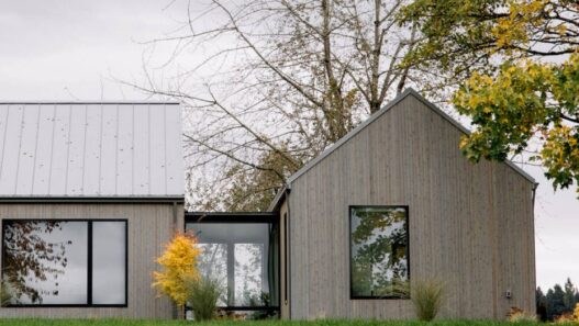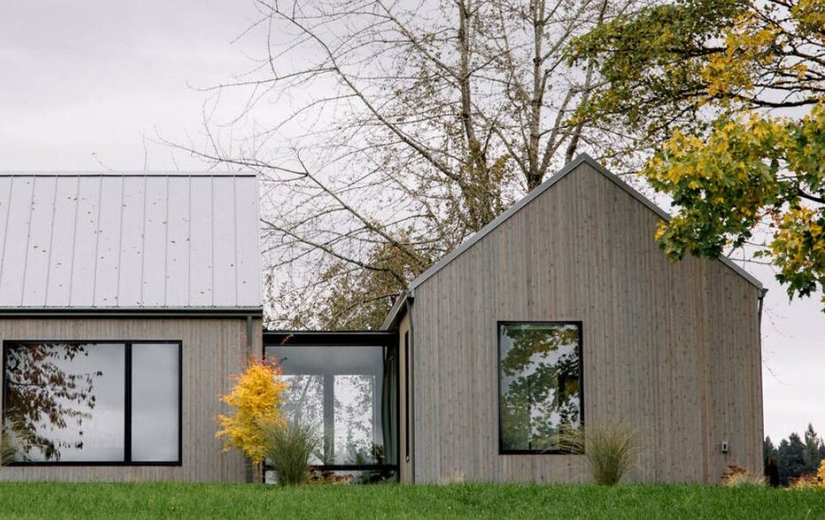 Серые фасады жилого строения облицованы кедром. Внутри дома с раздвижными дверями предусмотрены бетонные полы и большие окна. Интерьер отделан светлой древесиной (дуб). В комнатах установлена гармонично сочетающаяся с таким дизайном дубовая мебель.