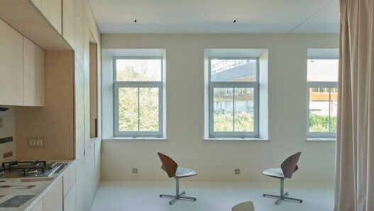 Дизайн интерьера сдержанный, здесь преобладает белый цвет и светлая древесина. Также при отделке подоконников, пола в ванной и некоторых других поверхностей использовались плиты терраццо.