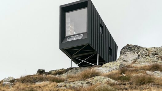 Спроектировала оригинальное жилище студия BCW Collective. Расположено здание на каменной плите на высоте 2528 метров над уровнем моря. Данное сооружение с большим окном изготовили заранее, затем доставили вертолетом на место и собрали за несколько дней. Конструкция состоит из деревянных панелей, облицованных алюминием.