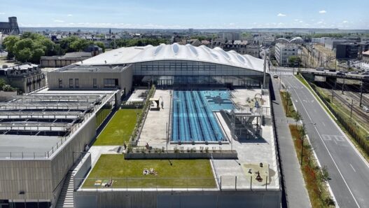 Территорию промзоны в городе Реймс решили использовать для возведения нового Центра водных видов спорта, общая площадь которого достигает 11 450 кв. м. Спроектировало это сооружение, получившее название UCPA Sport Station Grand Reims, бюро Марка Мимрама. Чтобы обеспечить защиту крытых бассейнов от взглядов посторонних в здании решено было предусмотреть технический цокольный уровень. Таким образом, искусственные водоемы находятся прямо над ним, что существенно выше уровня земли.