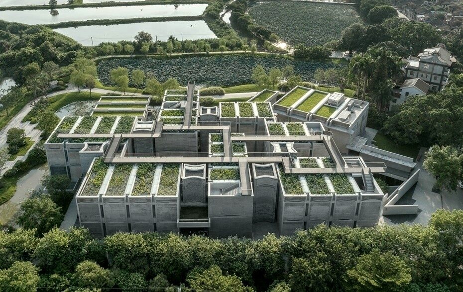 Общая площадь нового культурного центра Chun Yang Tai Cultural Center превышает 8,6 тыс. кв. м. Он представляет собой группу многочисленных бетонных объемов, каждый из которых увенчан садом на крыше и небольшим прудом. Такие блоки соединены криволинейными кирпичными стенами, образующими уютные переулки и дворики. Вся эта новостройка удачно гармонирует с планировкой и масштабом древней деревни.