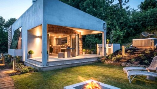 Бетонная кухня расположена рядом с крытой террасой. Во дворе также предусмотрен бетонный очаг и джакузи на открытом воздухе. Лаконичный «бетонный» дизайн можно увидеть и внутри здания. Из этого материала изготовлена значительная часть элементов интерьера, включая мебель, камин и т.д.