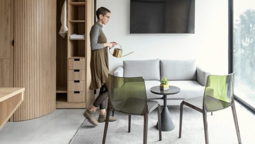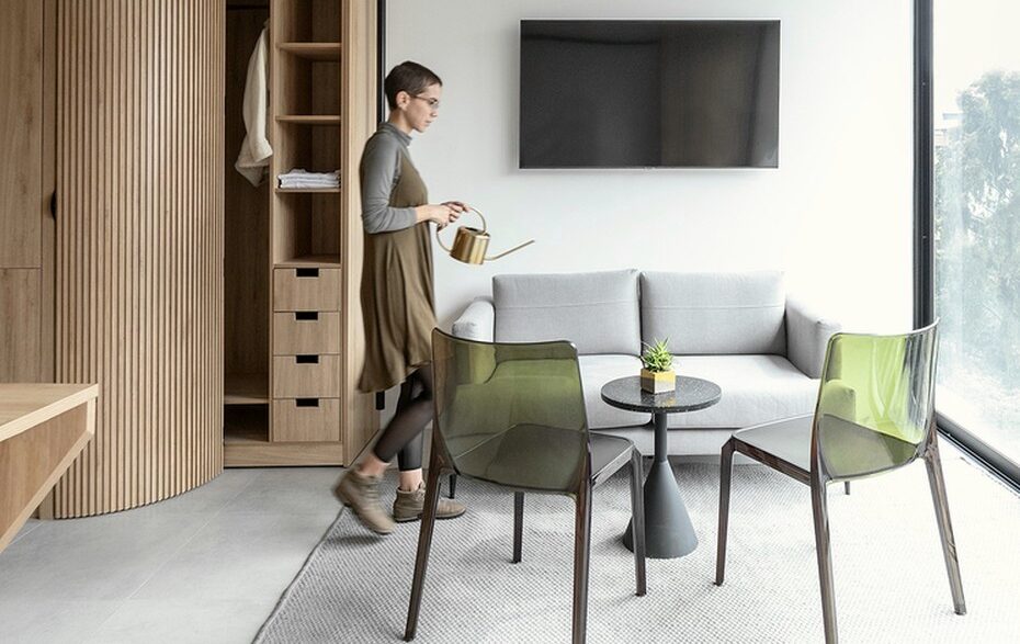 Этот проект реализовали Хуан Альберто Андраде и Мария Васконес. Площадь преобразившейся квартиры составляет всего 27,5 кв. м. Но благодаря тому, что многие функциональные блоки и предметы интерьера спрятаны в специальном модуле, небольшое помещение может легко трансформироваться в спальню, рабочий кабинет, кухню или столовую.
